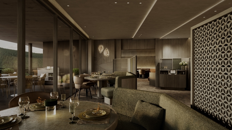 Exklusives Restaurant-Ambiente mit Bergkulisse