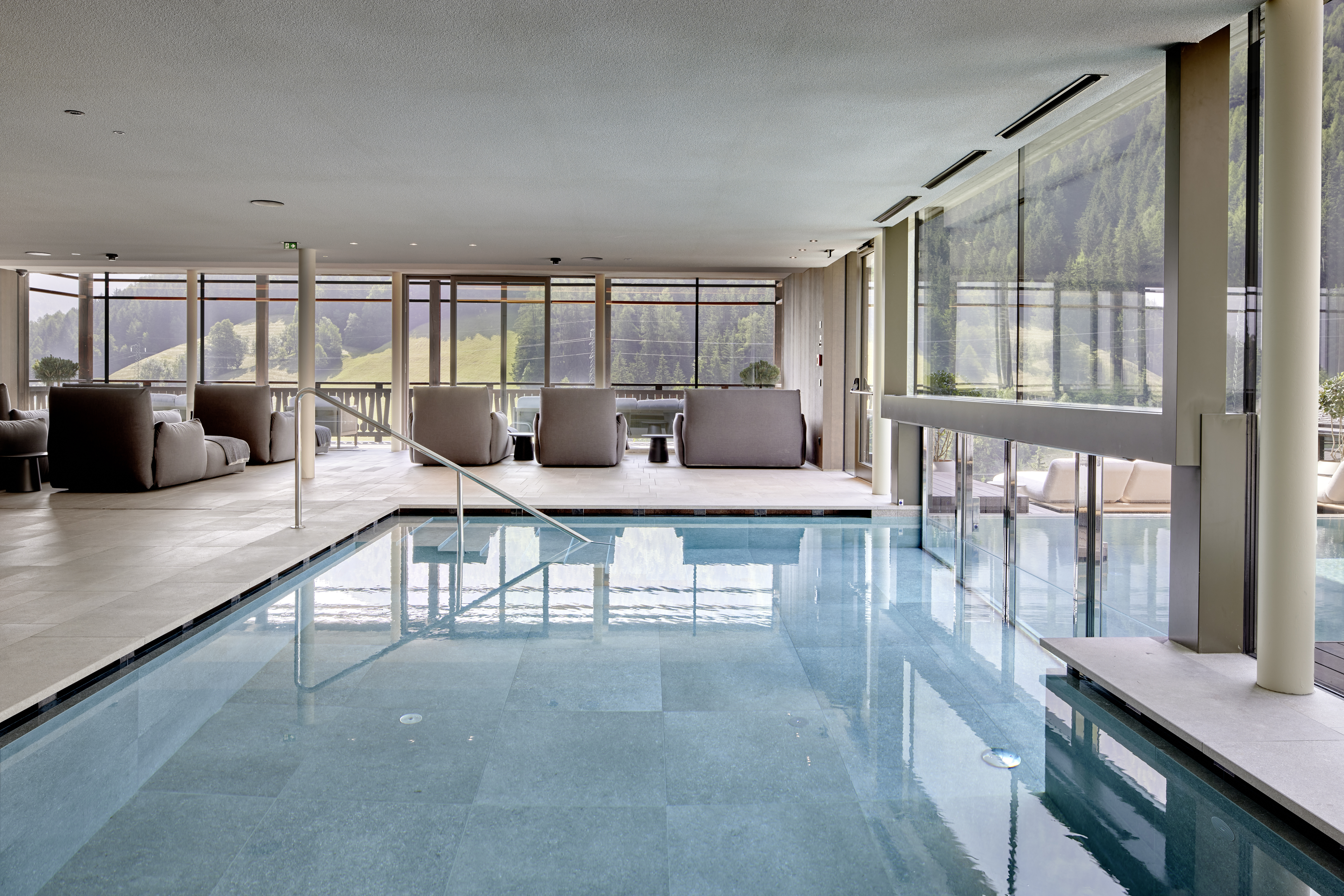 AMONTI Chalets Mühlwalderstraße 9 , 39032 Mühlen in Taufers / Südtirol +39 0474 651 010 info@amontichalets.com http://www.amontichalets.com Indoor-Pool mit Panoramablick ins Grüne Quelle: AMONTI Chalets 72 DPI 300 DPI
