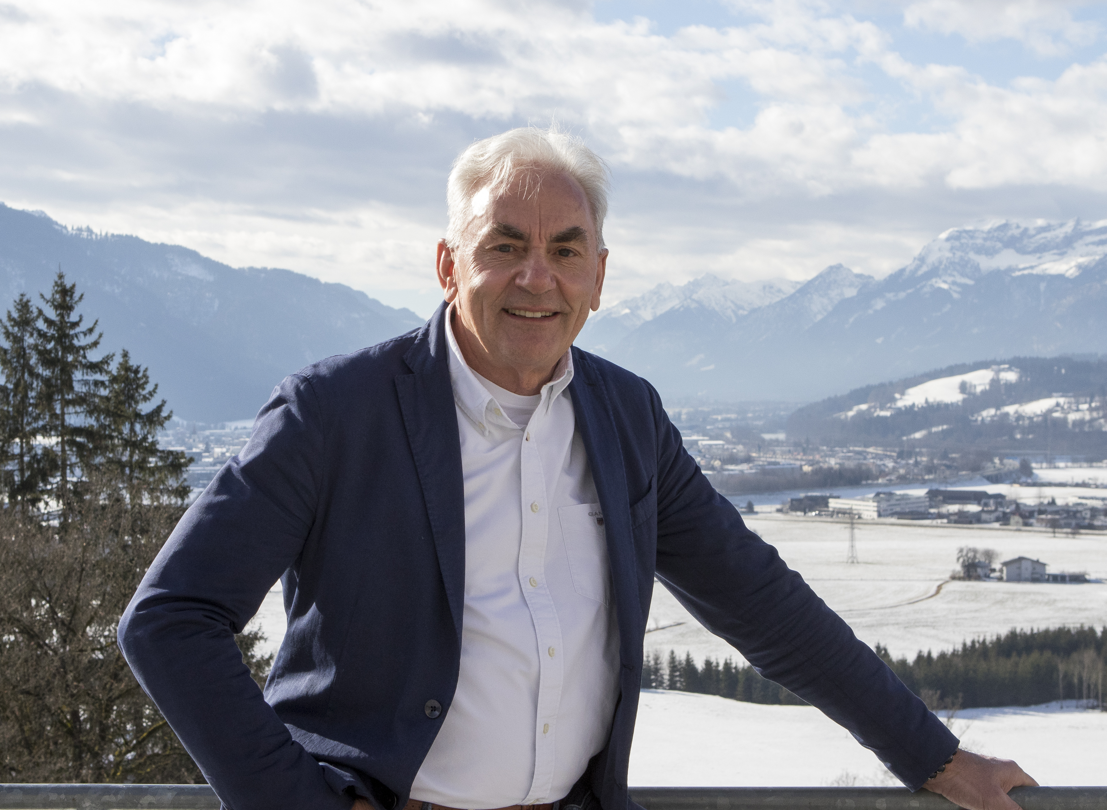 Hoteleigentümer mit Winterpanorama