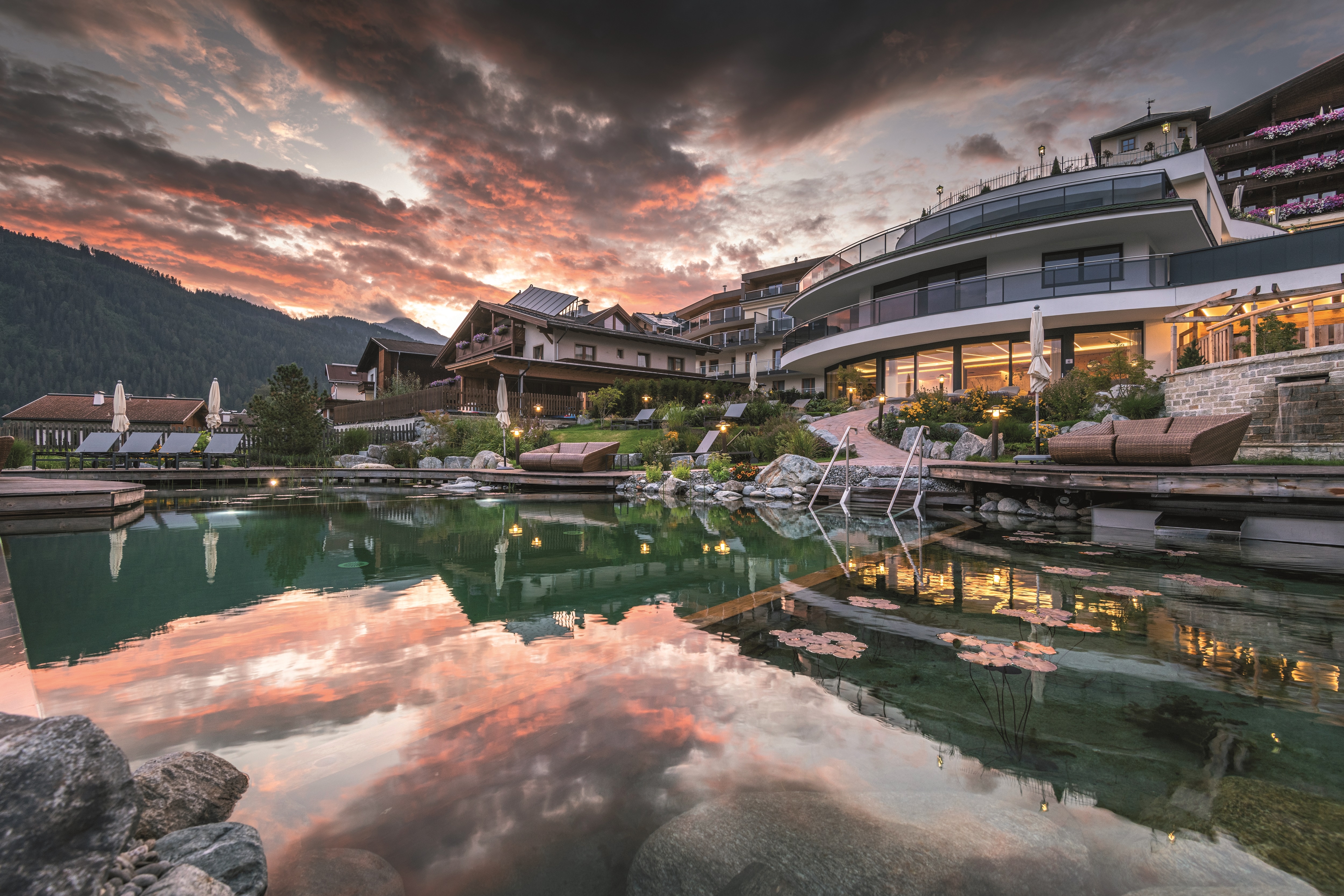 Hotelansicht mit Naturteich (Wellnessresidenz Schalber)